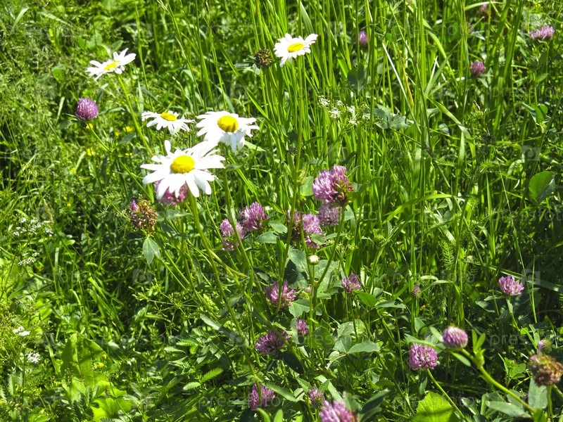 Полевые цветы летом: ромашки и клевер в солнечную погоду