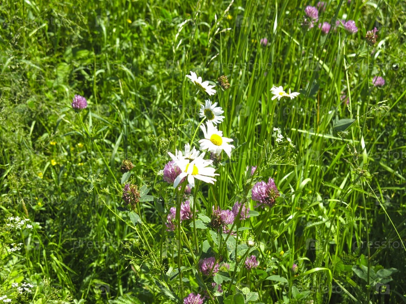 Полевые цветы летом: ромашки и клевер в солнечную погоду