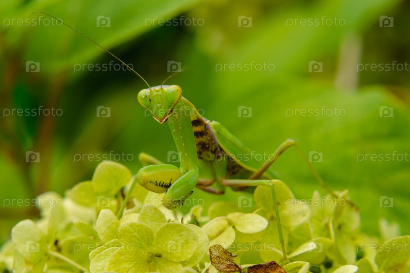 Макрофотография большого зеленого богомола, сидящего на цветочном листе. Передний план. Размытый фон. Понятие о диких насекомых