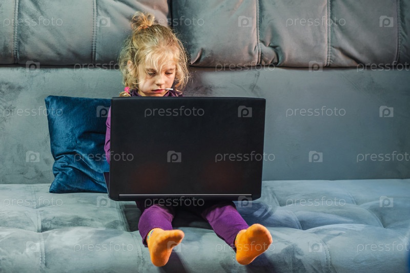 Блондинка с леденцом во рту сидит на сером диване с ноутбуком на ногах. Взгляд ребенка направлен на экран. Концепция цифрового детства