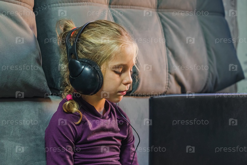 Заинтересованный ребенок школьного возраста в наушниках сидит на диване и смотрит обучающий видеоурок. Концепция дистанционного онлайн-образования