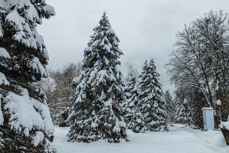 Высокие ели покрыты снегом. На одном дереве висят голубые елочные шары Зимний городской пейзаж