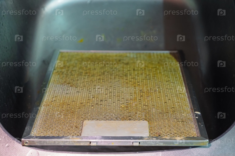 В раковине лежит грязный алюминиевый сетчатый фильтр от домашней вытяжки. Фильтр колпака покрыт смазкой