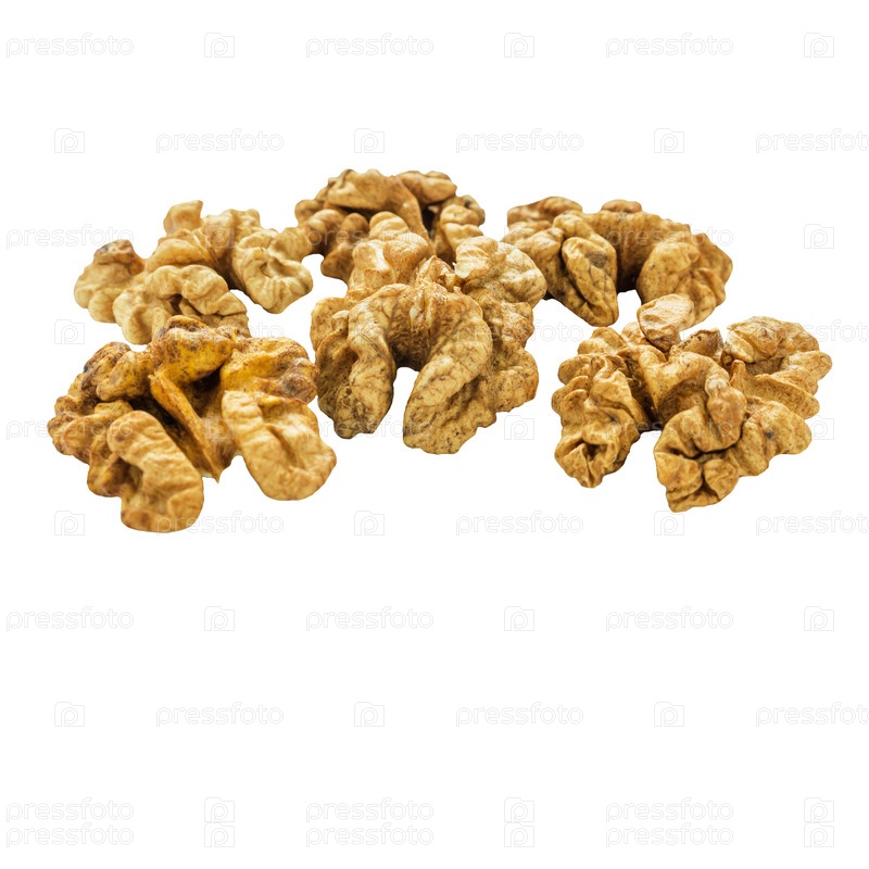 Горсть очищенных грецких орехов на белом фоне. Крупный план. Выборочный фокус