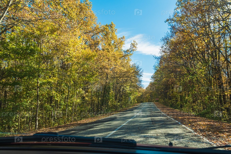 Вид из салона автомобиля на проселочную дорогу среди осеннего леса. На заднем фоне голубое небо. Концепция путешествия на машине