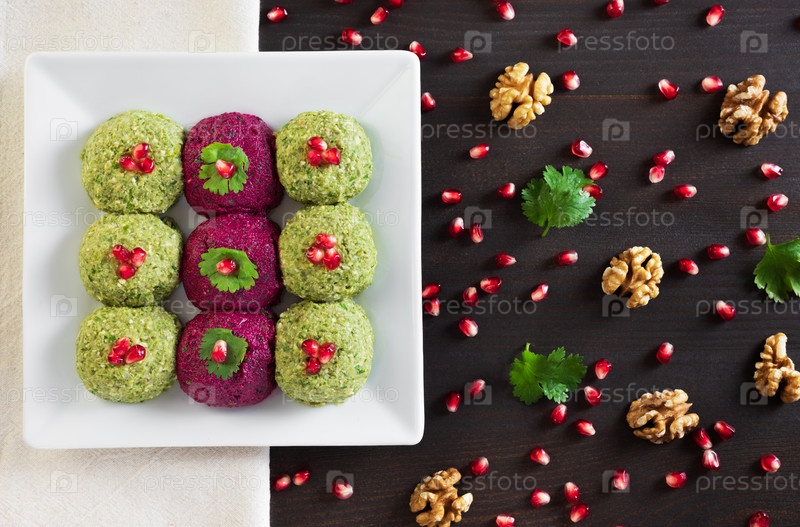 Пхали со свеклой и фасолью на темном деревянном фоне. Традиционное грузинское блюдо из овощей, грецких орехов и специй. Плоская планировка, вид сверху