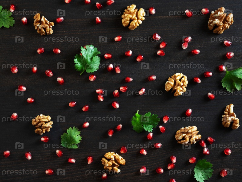 Продовольственный фон. Семена граната, грецкие орехи и кориандр на темном деревянном фоне. Образец еды. Плоская планировка, вид сверху