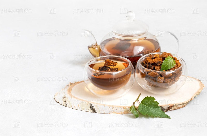 Напиток из грибов чаги в стеклянных мисках и чайнике на белом фоне. Полезный настой с кусочками чаги