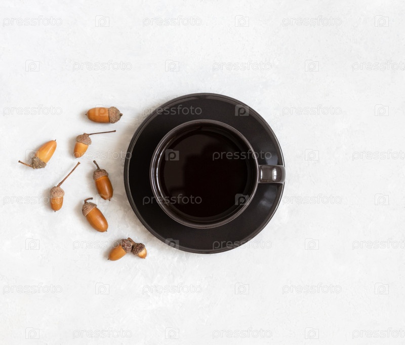 Кофе желудей в черной чашке на белом фоне. Натуральный заменитель кофе. Черный кофе с желудями. Вид сверху, плоская планировка