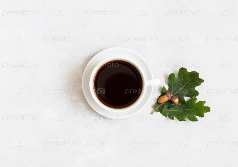 Черный кофе с дубовыми листьями и желудями на белом фоне. Чашка желудевого кофе. Концепция замены кофеина. Вид сверху, плоская планировка, пространство для копирования