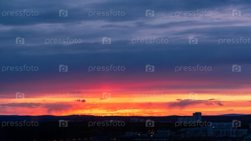 Облака рассвета над мегаполисом раннего захода солнца зимы в Екатеринбурге с серебристыми облаками