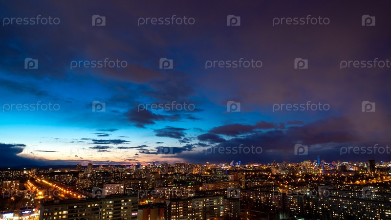 Облака рассвета над мегаполисом раннего захода солнца зимы в Екатеринбурге с серебристыми облаками