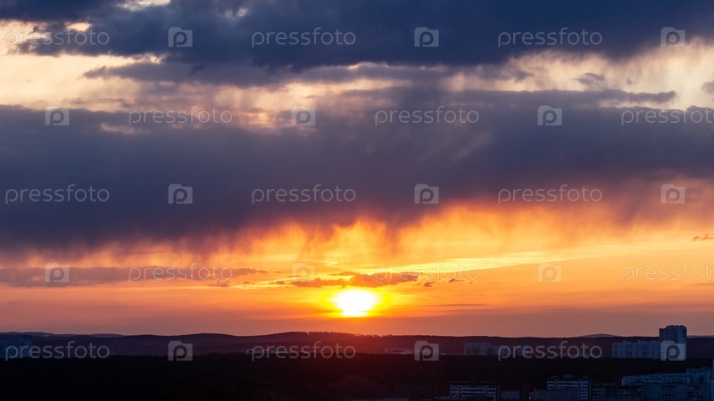 Облака рассвета над мегаполисом раннего захода солнца зимы в Екатеринбурге с серебристыми облаками