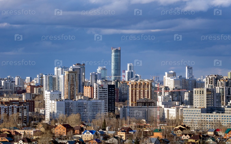 Рассветные облака над мегаполисом раннего зимнего заката в Екатеринбурге