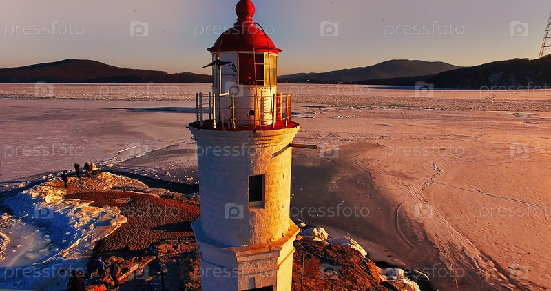 Пейзаж с белым маяком на фоне моря. Владивосток, Россия