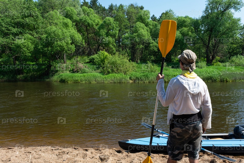 Мужчина с веслом для каяка для рафтинга стоит на берегу реки. Спортивный водный поход, летнее приключение. Экологичный и экстремальный туризм, активный и здоровый образ жизни