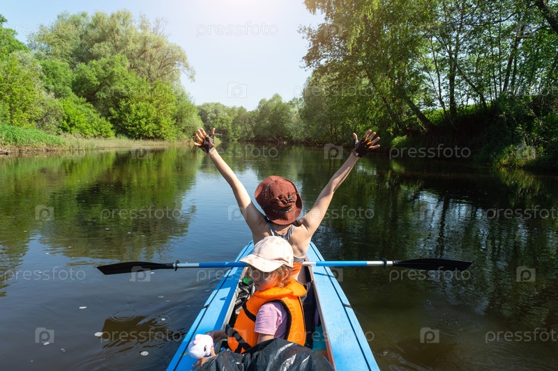 Семейный поход на байдарках. Мама и дочка катаются на лодке по реке, водный поход, летнее приключение. Экологичный и экстремальный туризм, активный и здоровый образ жизни