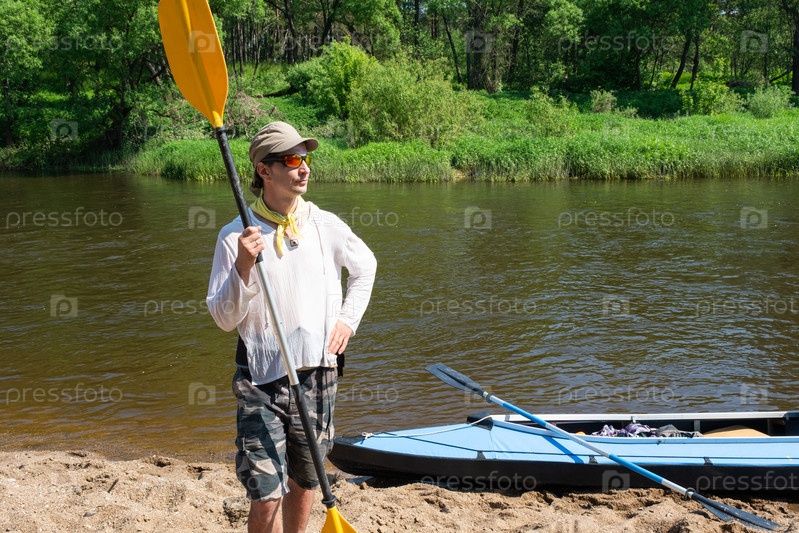 Мужчина с веслом для каяка для рафтинга стоит на берегу реки. Спортивный водный поход, летнее приключение. Экологичный и экстремальный туризм, активный и здоровый образ жизни
