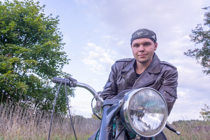 Портрет молодого человека с мотоциклом на улице