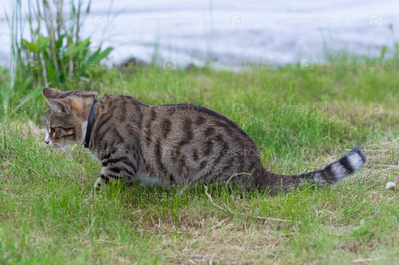 Красивая домашняя кошка гуляет по улице в теплое время года