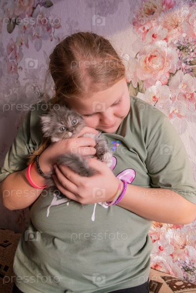 The girl is holding a little beloved pet kitten of the Turkish Angora breed in her arms Девочка держит в руках своего любимого домашнего котенка турецкой породы ангоры