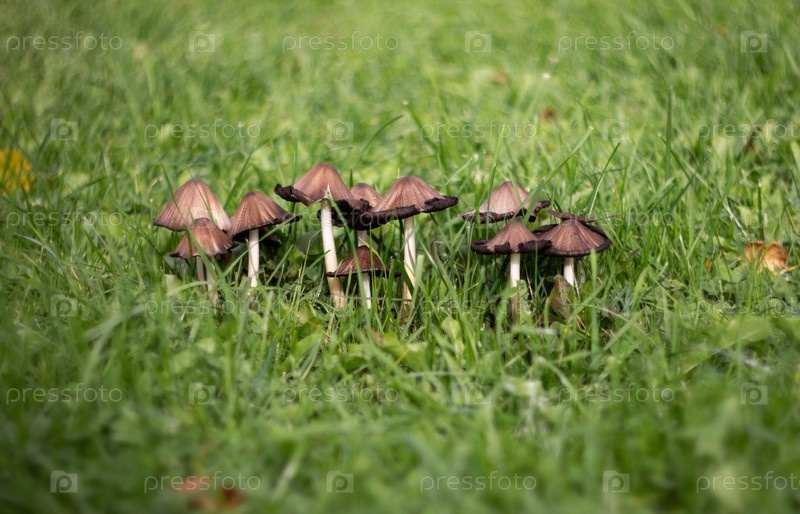Группа грибов на зеленом фоне газона, травы. Поганка грибов Брауна в макросе конца-вверх травы. Повреждение газона. В солнечный летний день