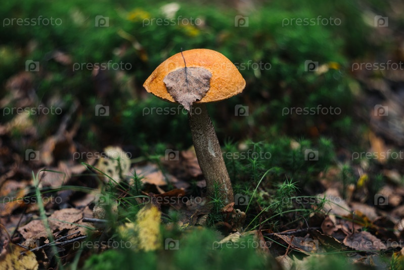 Осиновый гриб во мху, растущем в лесу. Маленький подосиновик крупным планом