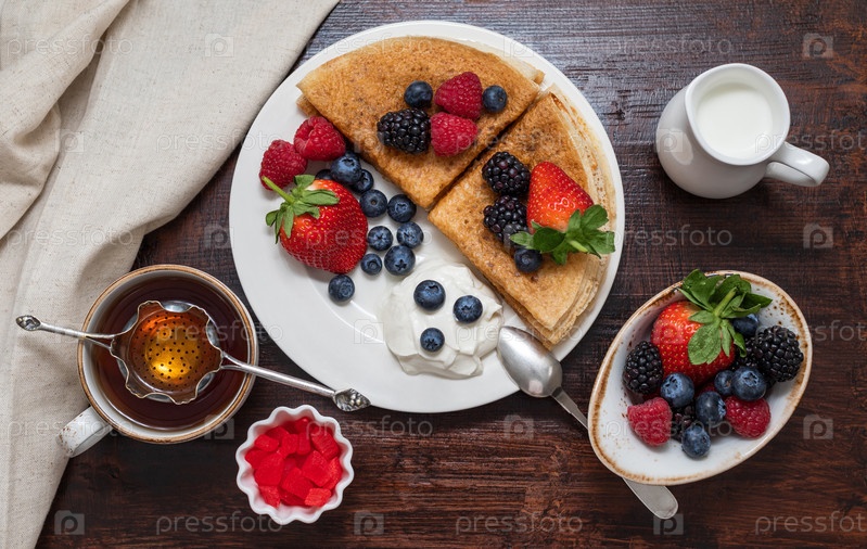 Блины с ягодами и сметаной на темном фоне. Здоровый и вкусный завтрак. Вид сверху. Сладкие блины в белой тарелке, чашка чая и молоко на деревянном столе