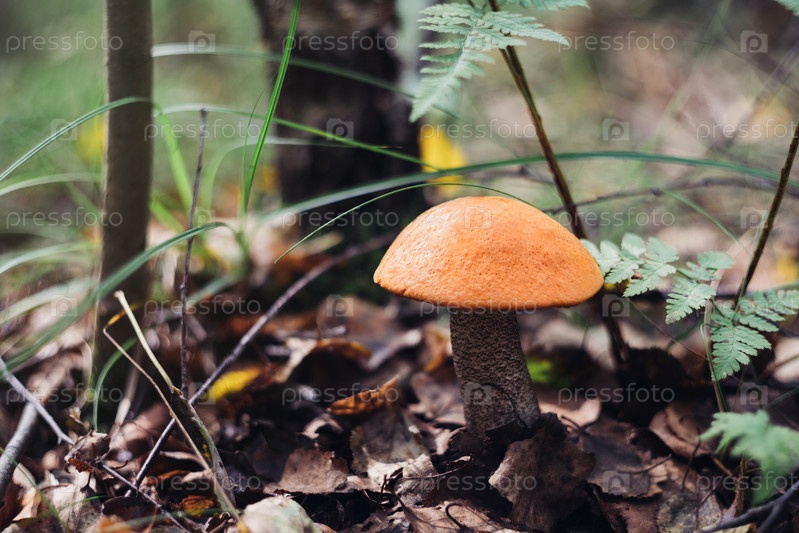Осиновый гриб в лесу крупным планом. Вкусный съедобный гриб. Подберезовик