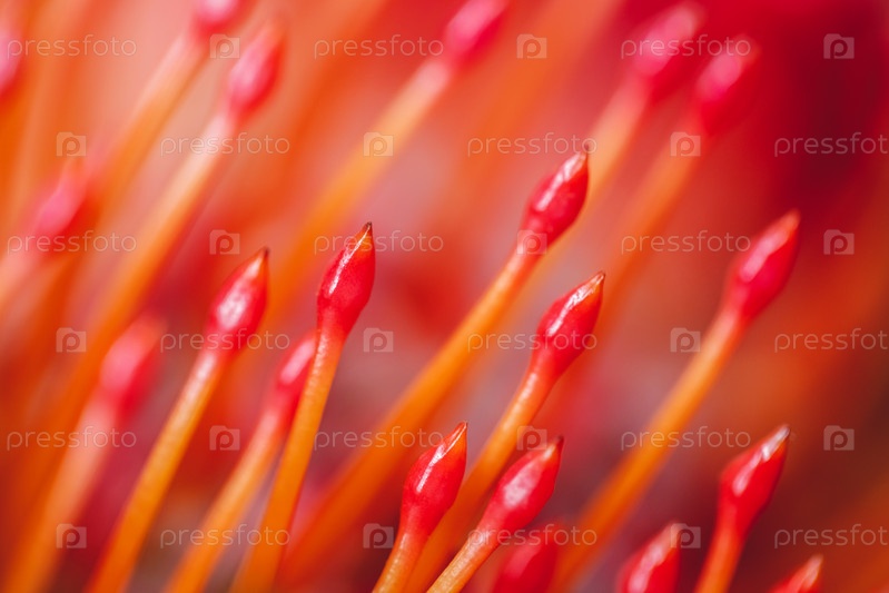 Красно-оранжевый цветок Pincushion Protea макрос крупным планом Абстрактный ярко-оранжевый фон и текстура Цветочный узор