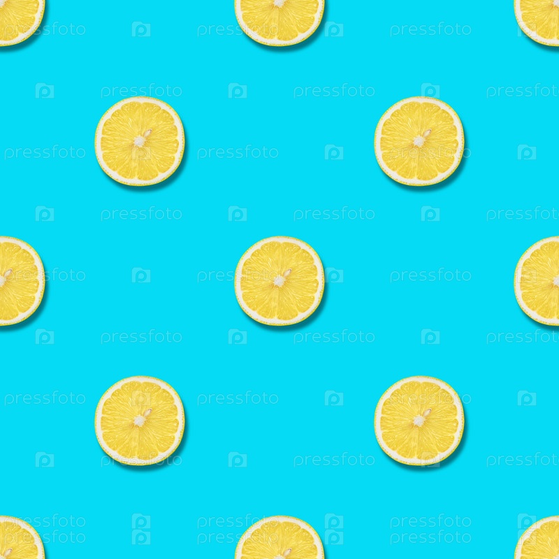 Бесшовный узор с лимоном на синем фоне. Тропический абстрактный фон. Концепция минимальных фруктов