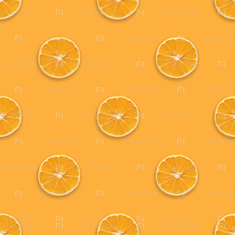 Бесшовный рисунок с апельсиновыми фруктами на оранжевом фоне. Апельсиновые ломтики бесшовной текстуры для дизайна. Летний фон. Фруктовый узор