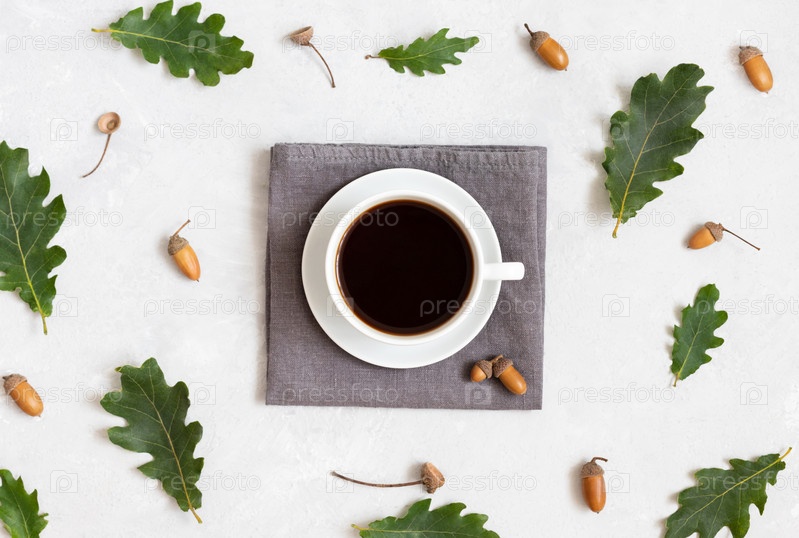 Черный кофе с желудями и дубовыми листьями на белом фоне. Желудевый кофе в домашних условиях. Заменитель кофеина. Вид сверху, плоская планировка