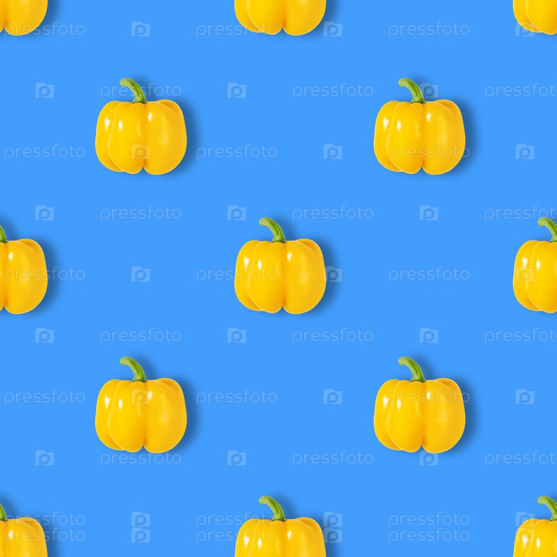 Желтый перец бесшовный узор на синем фоне. Овощной узор для печати. Летний абстрактный пищевой фон