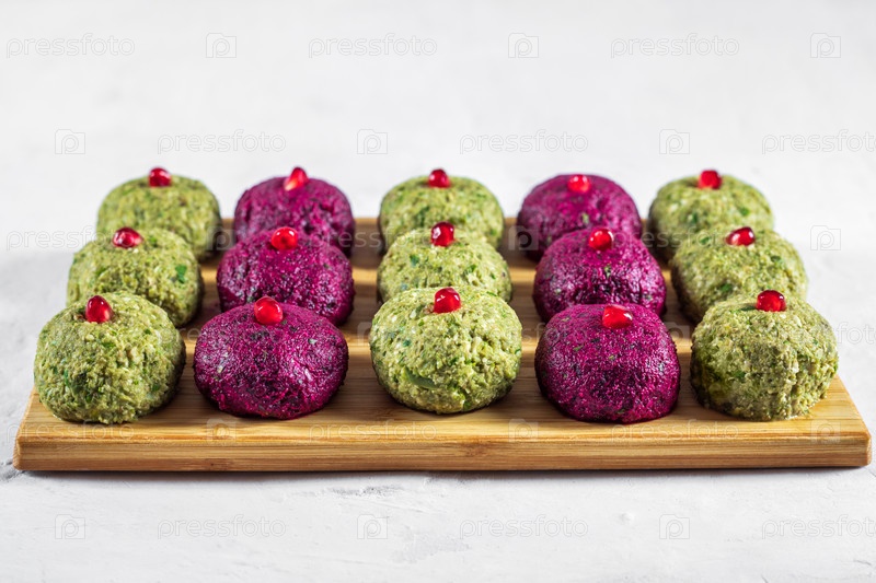 Пхали со свеклой и фасолью на разделочной доске на белом фоне. Традиционное грузинское блюдо из овощей, грецких орехов и специй