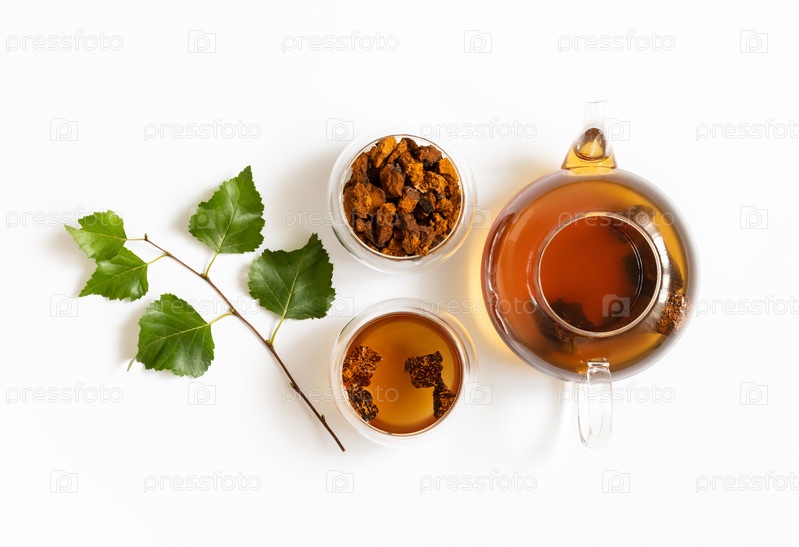 Настой с грибом чага, изолированные на белом фоне. Напиток с кусочками березового гриба в прозрачной посуде. Вид сверху