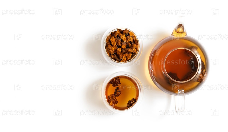 Чага чай и кусочки грибов чага в стеклянных мисках и чайник, изолированные на белом фоне. Скопируйте пространство, вид сверху, плоская планировка