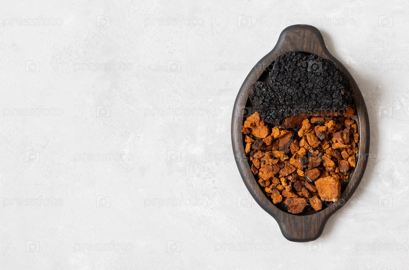 Гриб Чага. Нарезанные кусочки чаги в деревянной тарелке на белом бетонном фоне. Березовый гриб. Суперфуд. Скопируйте пространство, вид сверху, плоская планировка