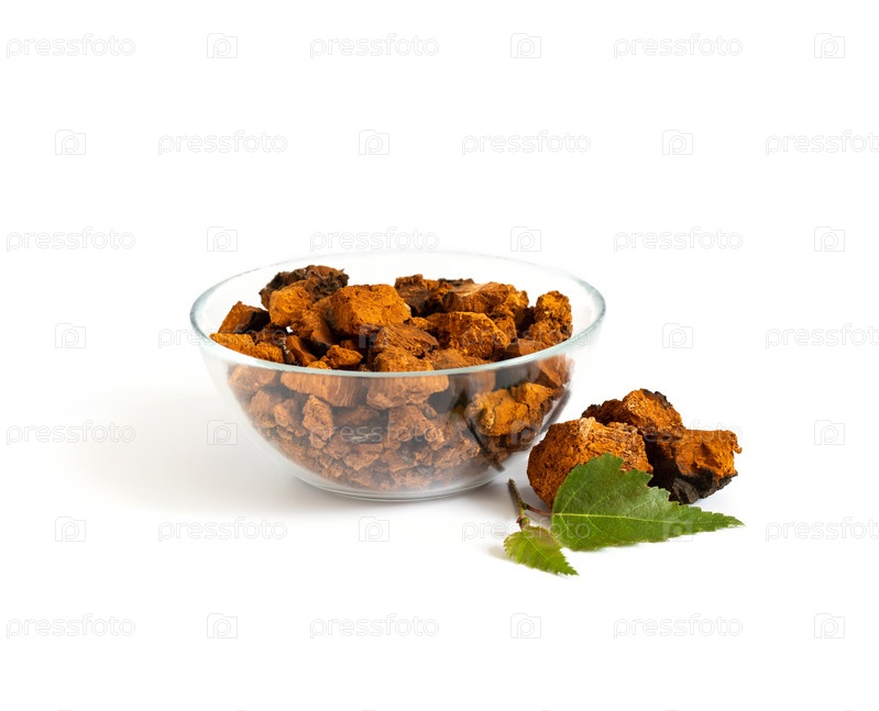 Гриб Чага. Нарезанная чага в миске и листья березы, изолированные на белом фоне. Инонотус косой