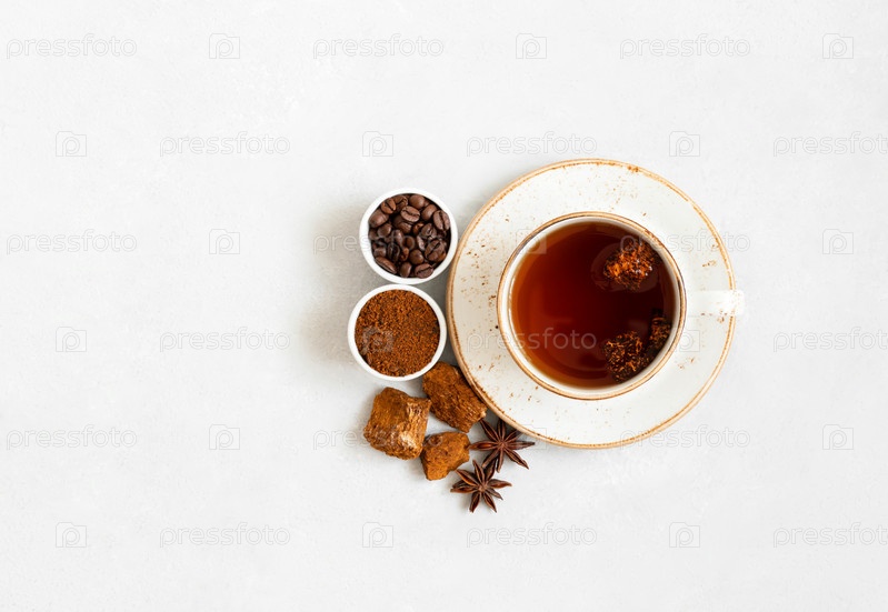 Чашка с напитком из грибной чаги и кофе на белом фоне. Модный суперфуд. Место для текста. Вид сверху, плоская планировка