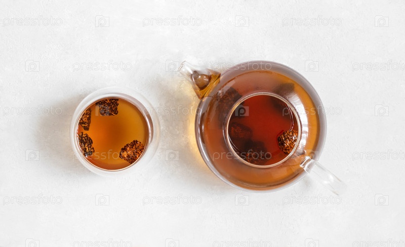 Пейте с грибом чага в стеклянном чайнике и миске на белом фоне. Модный здоровый напиток. Вид сверху, плоская планировка