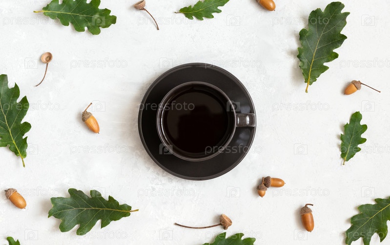 Узор с кофе в черной чашке, дубовыми листьями и желудями на белом фоне. Кофе с желудями без кофеина. Вид сверху, плоская планировка