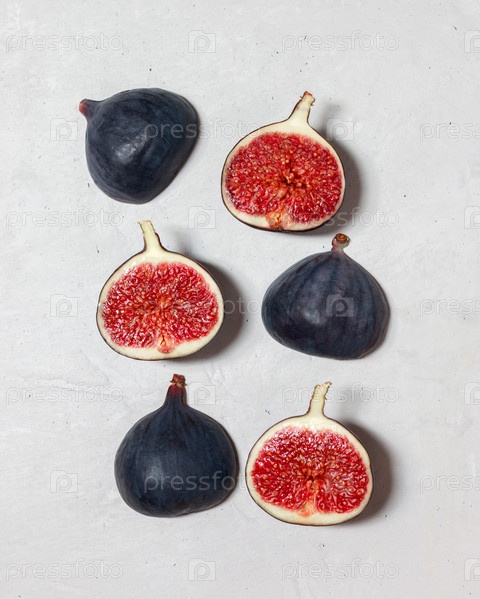Свежий инжир на сером бетонном фоне. Фотография еды. Фиолетовый инжир с красными семенами. Плоская планировка, вид сверху. Концепция питания
