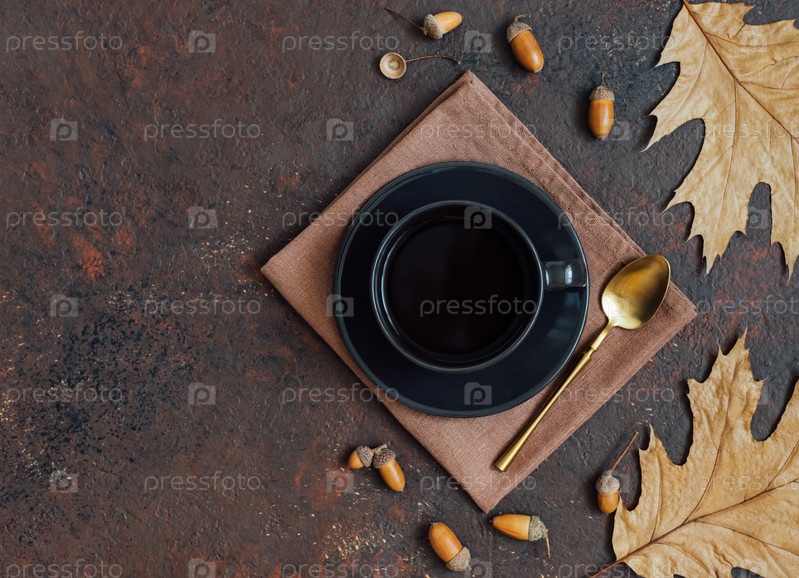 Осенний натюрморт с кофе, желудями и листьями. Кофе желудей в черной чашке на коричневом фоне. Скопируйте пространство, вид сверху, плоская планировка