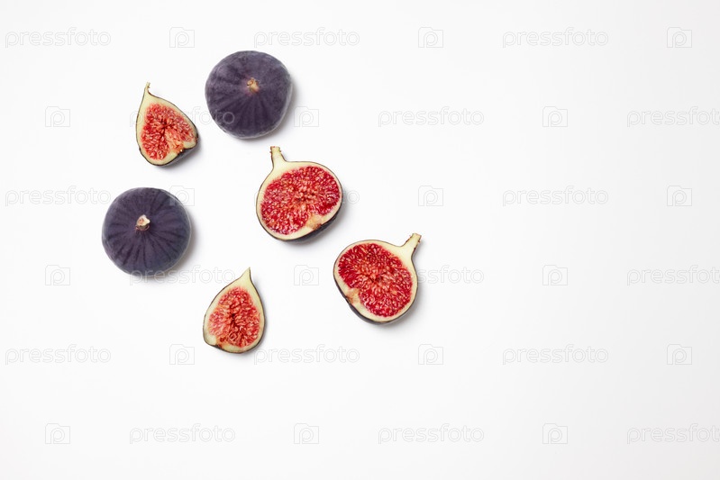 Свежий инжир, изолированные на белом фоне с пространством для текста. Фотография еды. Скопируйте пространство. Фиолетовый инжир с красными семенами. Плоская планировка, вид сверху