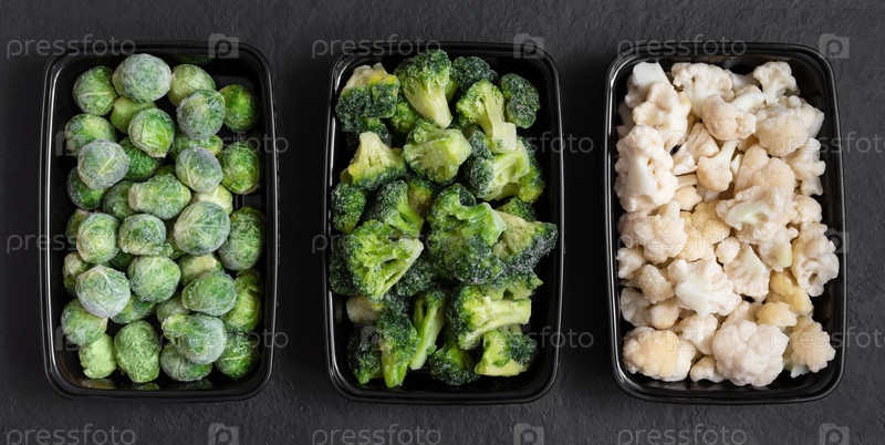 Набор замороженных овощей в контейнерах на черном фоне. Брюссельская капуста, цветная капуста, брокколи. Вид сверху