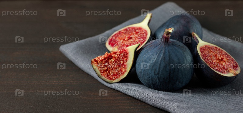 Свежий инжир на темном фоне с копией пространства. Фиолетовый спелый нарезанный и целый инжир на серой салфетке. Вид сбоку. Инжир на коричневом деревянном фоне