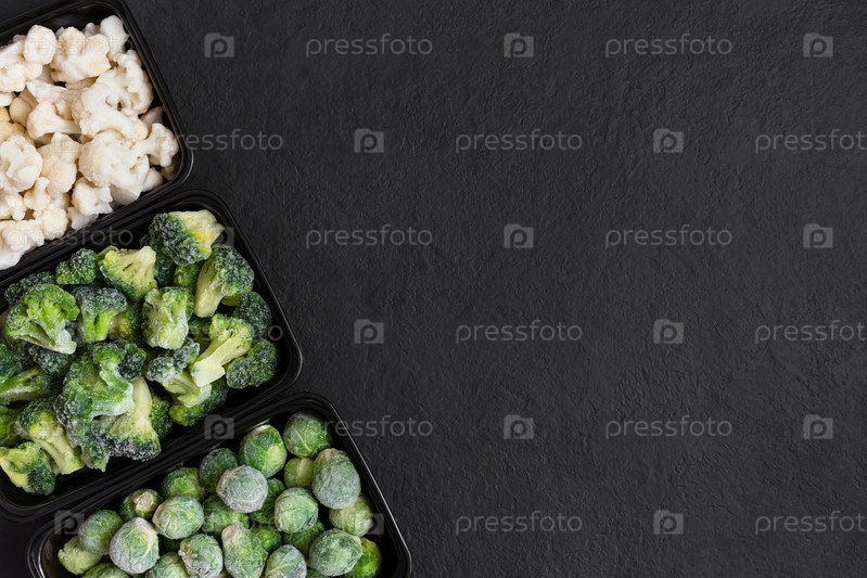 Рамка из замороженных овощей в контейнерах на черном фоне. Капустная смесь. Вид сверху. Скопируйте пространство