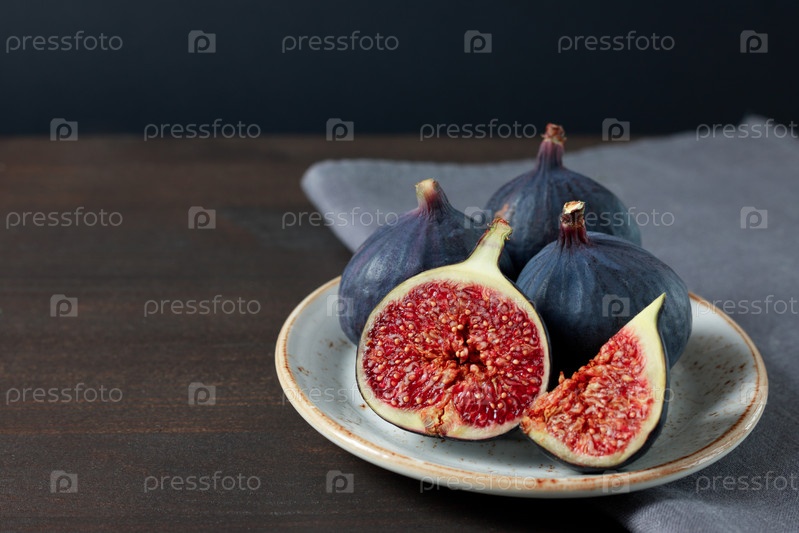 Свежий инжир в белой тарелке на темном фоне. Скопируйте пространство. Фиолетовый спелый нарезанный и целый инжир на серой салфетке. Вид сбоку. Инжир на коричневом деревянном фоне