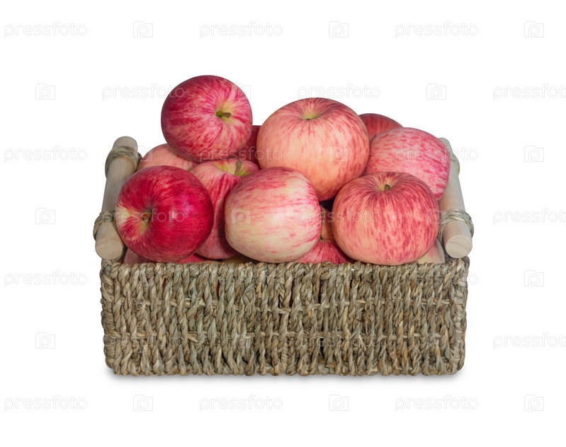 Красные яблоки в корзине изолированы на белом фоне. Свежие сочные яблоки. Осенний урожай